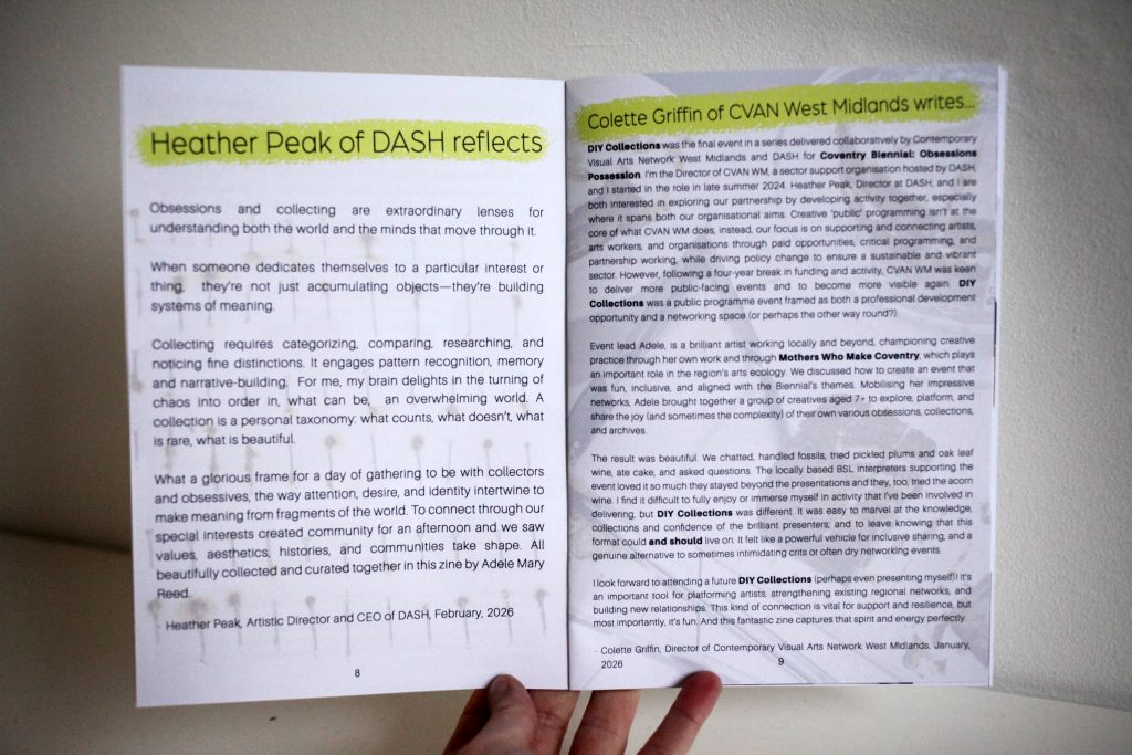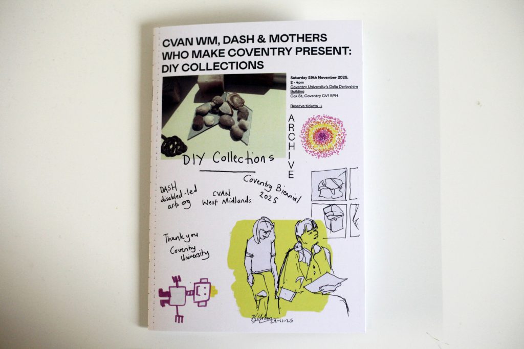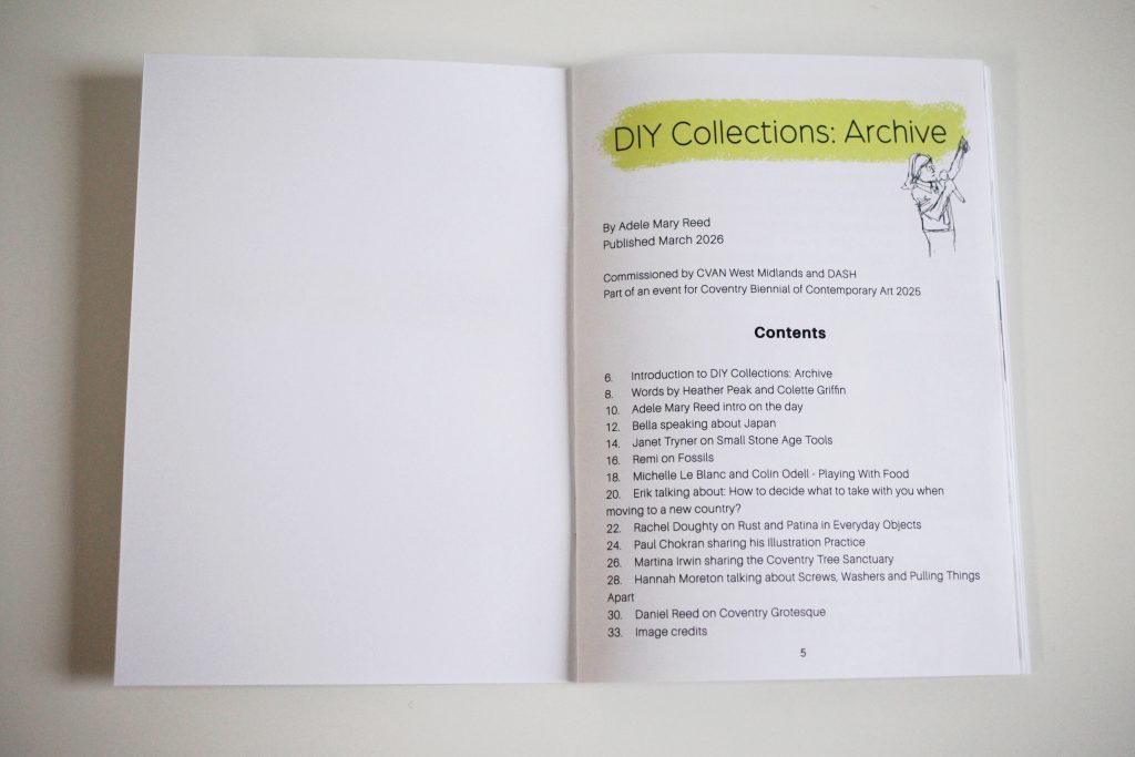 DIY Collections: Archive is a publication commissioned by CVAN West Midlands and DASH to create documentation of the event DIY Collections which took place as part of Coventry Biennial 2025: Obsessions, Possessions. The event was held at the Delia Derbyshire building, the arts faculty of Coventry University, on 29th November 2025.